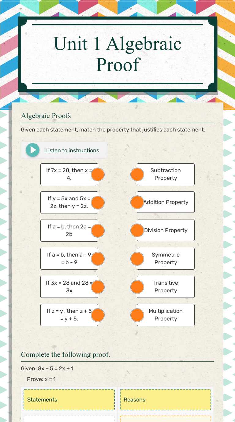Algebraic proof alist of algebraic steps to solve problems where each step is justified is called an algebraic glencoe geometry. Some of the worksheets for this concept are solve each write a reason for every, algebraic proofs gcse higher tier aagrades ks4. Kigose thousands of , algebraic proof chapter 2 section ppt download , trigonometry laws and identities math sheet electronics , addition property of equality worksheet pdf free. • algebraic proofs are two column proofs of standard algebra problems that are solved with reasons for each step. This pack covers algebraic proof topic areas for the gcse 2017 specifications. Download file (102.9k) download file (108.0k). Found worksheet you are looking for? Worksheet given in this section is much useful to the students who would like to practice problems on algebraic identities. Worksheets are practice a 2 5 algebraic proof, solve each write a reason for every, practice b 2 2 algebraic proof, name date period 2 6 study guide and intervention, practice a geometric proof. Before diving headfirst into geometrical proofs, it's a good idea to revisit algebra. Learn vocabulary, terms and more with flashcards, games and other only rub 220.84/month. This set of evaluating algebraic expression worksheets features skills like evaluating single and multivariable expressions, evaluating equations and more. Algebraic proofs worksheet show your teen the proof ask her to tell you which step is invalid she should determine both which number is wrong and why help her keep going until she understands the.